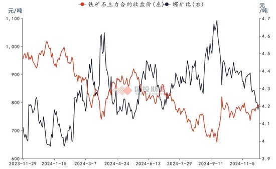 地产大周期仍未摆脱下行趋势,季节性又处于传统的需求淡季(图4),因此,需求端对螺纹仍有拖累,另外需要考虑的是成本端。尽管近期上游铁矿比螺纹更为坚挺些,但在需求不佳时,低螺矿比会对铁矿的反弹带来一定负反馈(图5),因为对于钢厂而言,在经历2023年春节前后铁矿过山车的行情,又面临当前炼钢利润不佳时,尽管会补库,但补库相对会更加谨慎些。因此,螺纹将决定铁矿反弹的上限,而短期铁矿的自身供应将决定其下限。