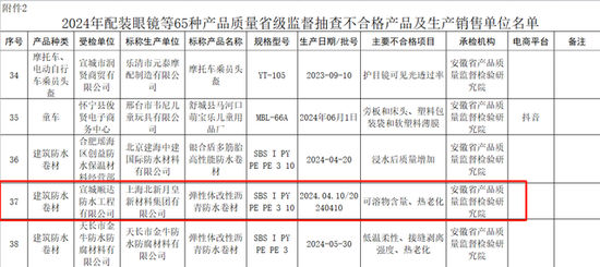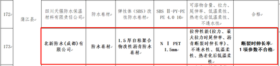 据媒体综合消息,11月25日,重庆市市场监督管理局发布“关于2024年摩托车及电动自行车乘员头盔等 6种产品监督抽查情况的通告”,其中由北新防水(成都)有限公司生产的弹性体改性沥青防水卷材、自粘聚合物改性沥青防水卷材分别因接缝剥离强度、热老化指标被爆不合格,且在复检中仍不合格。