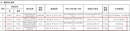 10月30日,河北省市场监督管理局发布《关于家用燃气灶等产品质量监督抽查结果的通告》,其中北新防水生产的三款产品防水卷材抽检均不合格,不合格项为浸水后质量增加、可溶物含量不合格。其不合格产品流向涉及到承德、廊坊、邯郸等地。